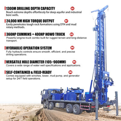Con un motore diesel Cummins 360 CHP montato su un robusto telaio Howo Sinotruck 8x4, il CSD1300 è appositamente costruito per terreni impegnativi e durata a lungo raggio. Dai villaggi remoti alle zone di costruzione industriali, questo impianto trasforma qualsiasi sito in una stazione di perforazione autonoma e autonoma, completa di configurazione del generatore, torre a vasca idraulica, argani e una pompa di fango ad alta pressione BW1500/12.