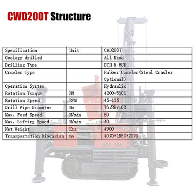 La piattaforma per trapano rotanti per well Well Well Well Well Well Cwd200T è progettato per operazioni di perforazione versatili in varie formazioni geologiche. Utilizza la perforazione del fango per formazioni morbide e martello DTH Air per la perforazione di roccia, con pressione dell'aria per scarico delle scorie, offrendo un'efficienza significativamente più alta rispetto alla tradizionale perforazione rotante.